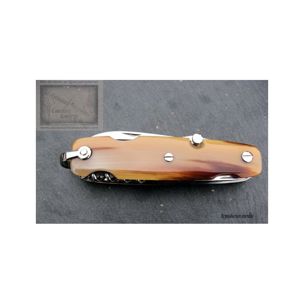 Canif comprenant. Lame,tire-bouchon,décapsuleur, tournevis, poinçon, petite lame.,ciseau et scie