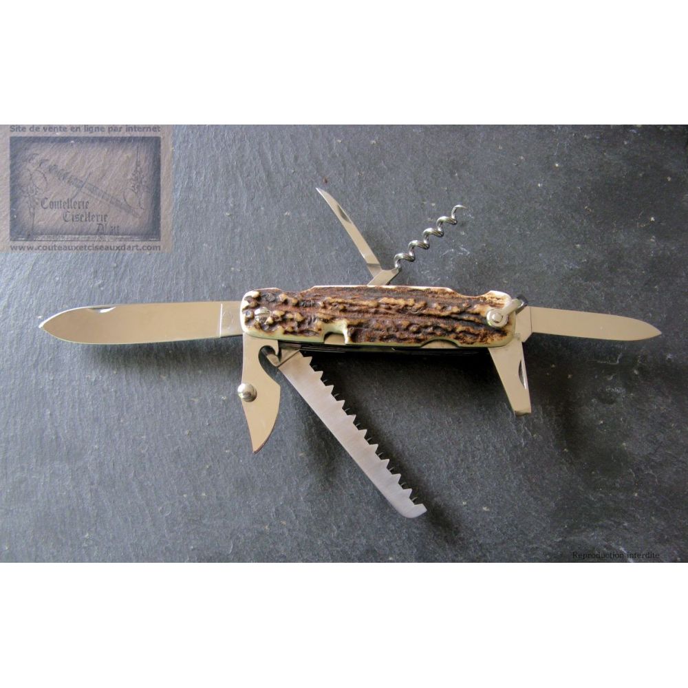 Canif comprenant. lame,tire-bouchon,décapsuleur, tournevis, poinçon, petite lame et scie