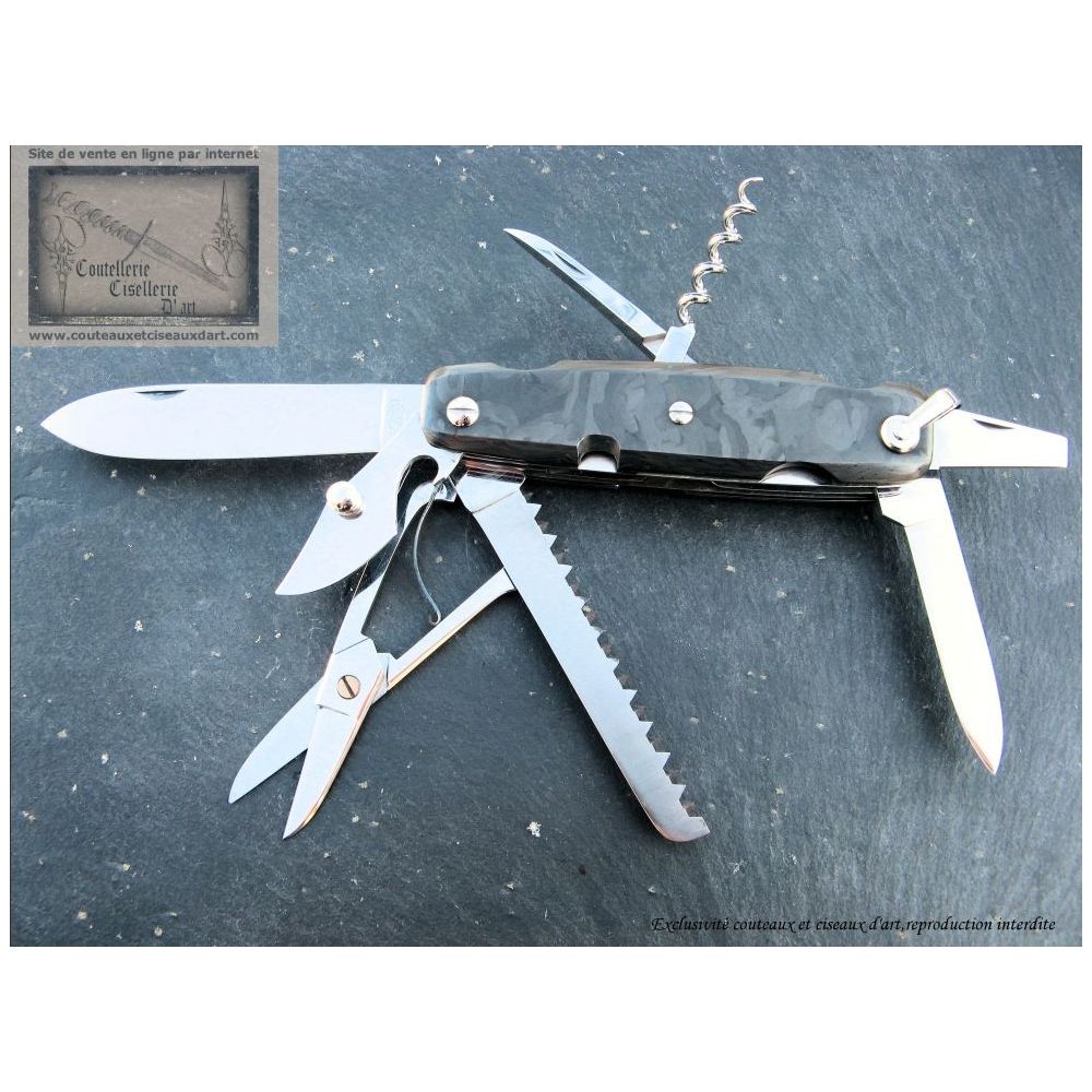 Le canif en fibre carbone damas est vendu exclusivement par la coutellerie Couteaux et ciseaux d'art.