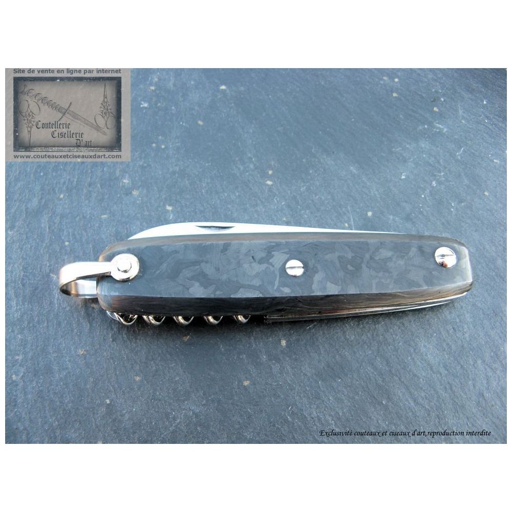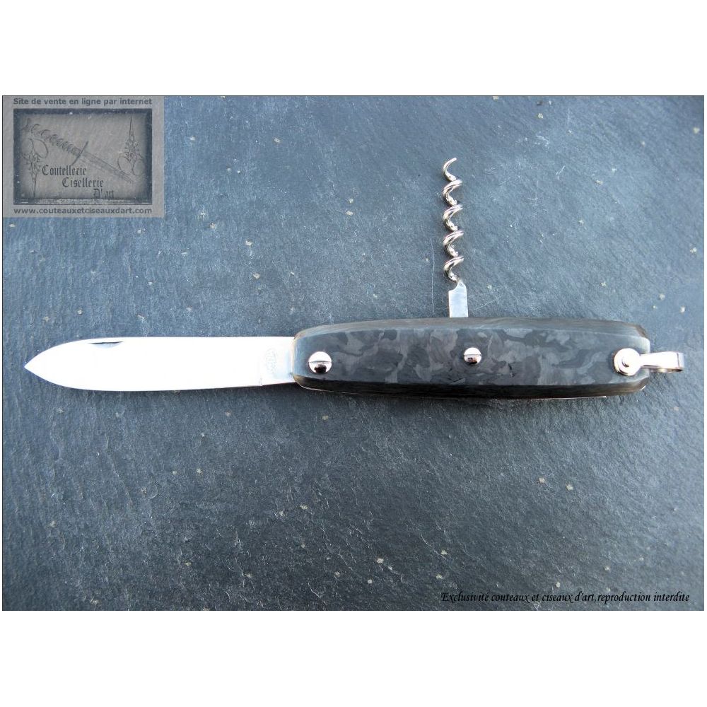Le canif en fibre carbone damas est vendu exclusivement par la coutellerie Couteaux et ciseaux d'art.