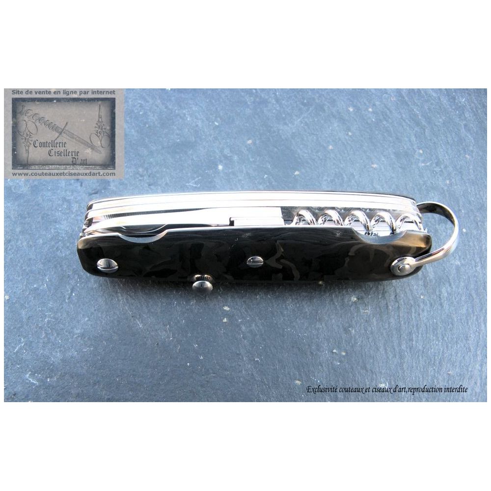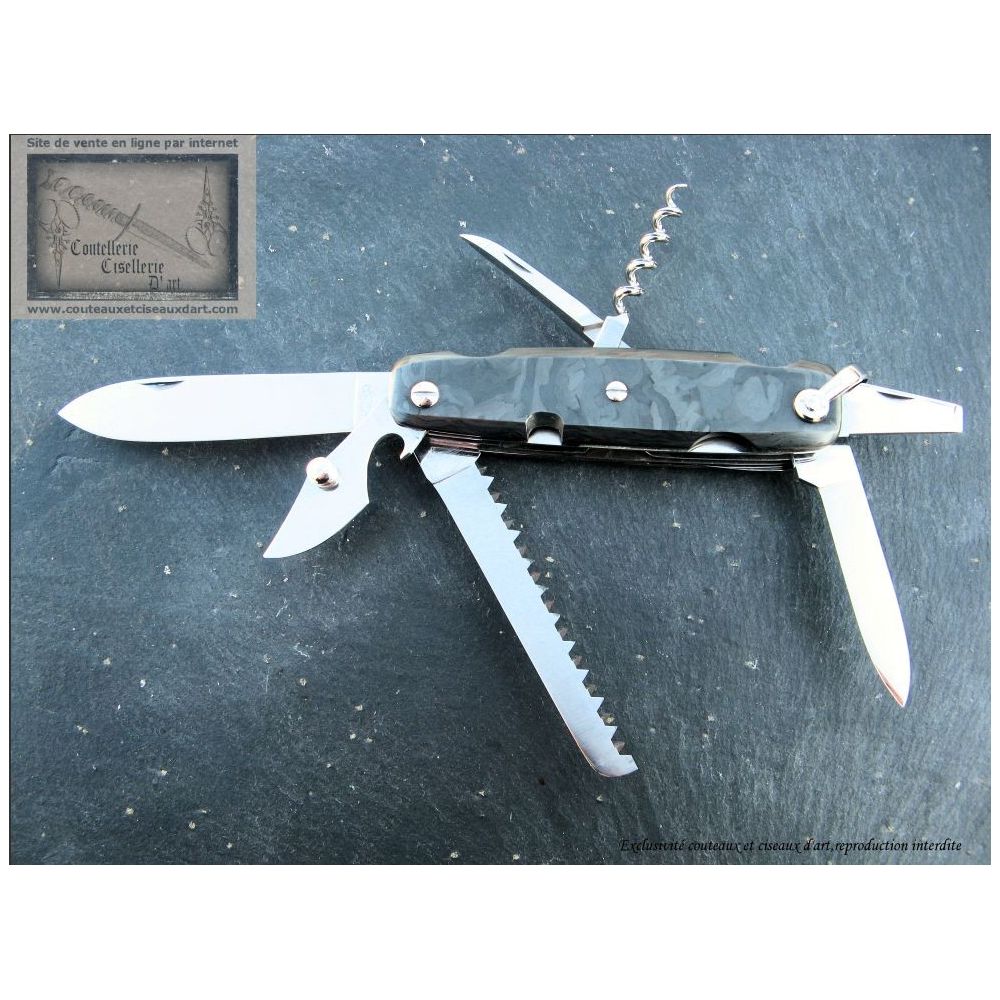 Le canif en fibre carbone damas est vendu exclusivement par la coutellerie Couteaux et ciseaux d'art.